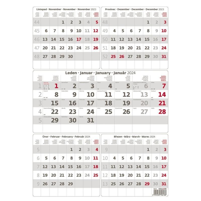Formát kalendáře: 31,5 x 45 cm </br> Kalendárium: české pětiměsíční jmenné + svátky vybraných evropských států (CZ / SK / A / B / D / F / H / CH / I / PL / RUS / UKR) </br> Rozsah kalendáře: 12 listů </br> Prostor pro přítisk: 31,5 x 7 cm </br> </br> + od 50 ks...