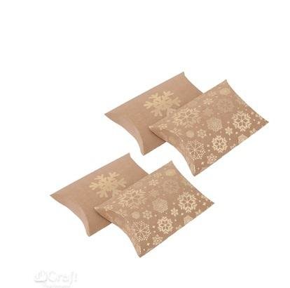 Pudełka składane typu pillow box z motywem złotych śnieżynek sprawdzą się doskonale jako opakowania na świąteczne prezenty. Można schować do nich różne, drobne upominki takie jak vouchery podarunkowe lub biżuteria. Te tekturowe pudełka nadają się również do dodatkowego zdobienia np. drewnianymi...
