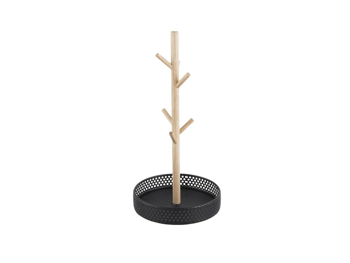 Dřevěný stojan na šperky s černým podstavcem.