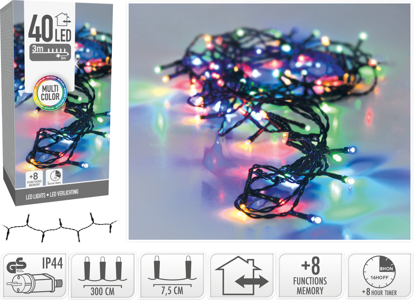 Vánoční světýlka 40 LED žárovek pro vnitřní i venkovní použití. Barva žárovek - barevná. Časovač.8 paměťových funkcí.Rozměry - celková délka 6 m (3 m kabel se žárovkami + 3 m přívodní kabel). prečítať celé