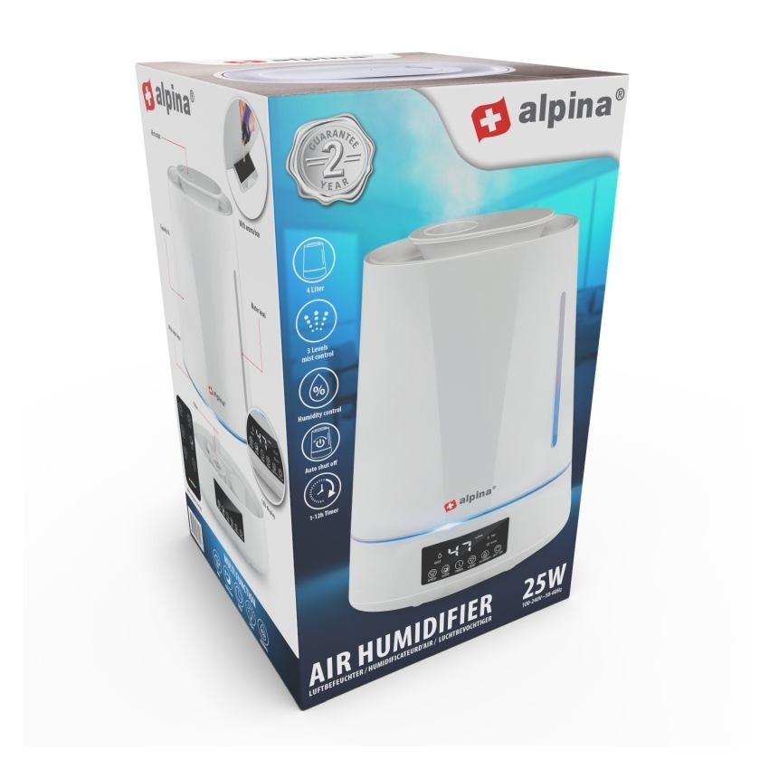 Zvlhčovač vzduchu – tento zvlhčovač vzduchu vytváří mlhu, aby zvlhčoval vzduch ve vašem domě. To pomáhá při suché pokožce, popraskaných rtech a ucpaném nosu.Difuzní vlhkost – se zvlhčovačem vzduchu alpina určujete vlhkost vzduchu ve vaší domácnosti. Zvlhčovač je nastavitelný v 5 stupních od 45 %...