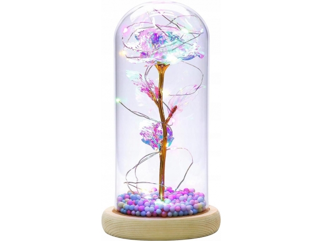 Táto sklenená ruža zdobená farebnými korálkami nielen očarí svojim vzhľadom, ale vďaka jemnému LED osvetleniu zároveň vytvára príjemnú atmosféru, ktorú je možné jednoducho zapnúť alebo vypnúť. Ruža je umiestnená pod ochrannou priehľadnou kopulou, ktorá ju chráni a zabezpečuje dlhú životnosť. Stojan je vyrobený z ekologického dreva, čo dodáva celému výrobku prírodný a ušľachtilý vzhľad.