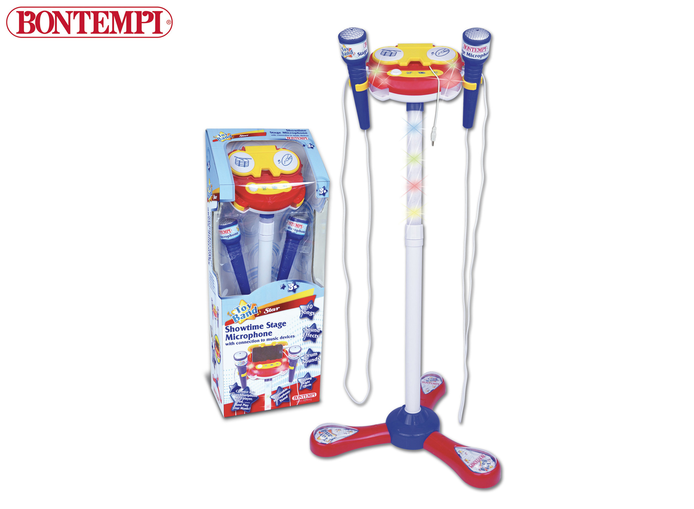 Scénický mikrofon ? 2 nastavitelné mikrofony ? Nastavitelný stojan ? 10 demosongů ? Potlesk a davy zvukových efektů ? 6 rytmů bubnů ? Světelné efekty ? Připojení k přehrávači MP3 (Smartphone, iPod, CD přehrávač ...), vestavěný kabel ? Napájení napájení: 3 baterie R6 / AA 1,5 V (nejsou součástí balení) ? Rozměr: 360x360x890 mm