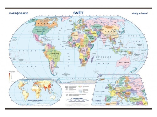 Přepracované vydání politické mapy světa. Na mapě v novém plochojevném zobrazení naleznete zobrazené státy světa, jejich hlavní města a vybraná největší města světa (stav k roku 2023). Mapa je nově doplněna vyobrazením hustoty zalidnění. •Svět v měřítku 1 : 26 000 000 v administrativním dělení...