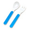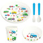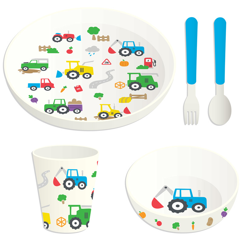 Znovupoužitelná dětská sada nádobí 5 kusů z recyklovaných plastových lahví RPET hrnek, miska, talíř a příbor - Malé traktory