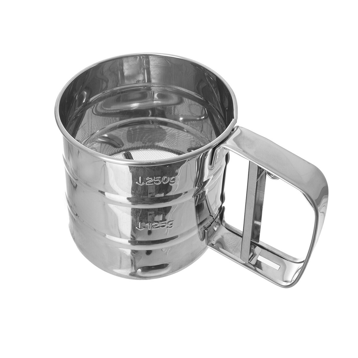 Mechanické síto Vám pomůže snadno a dokonale prosít mouku, cukr... Jednoduše několikrát stisknete mechanismus na uchu, který otáčí podložkou a ta prosívá mouku skrz sítko. Vyznačení odměrky pro 125 g a 250 g. Materiál: nerezová ocel. Rozměry: pr. 10,5 cm, v. 9,5 cm. Není možné mýt v myčce.