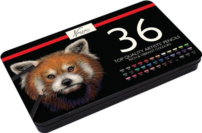 Tato kovová krabička obsahuje 36 vysoce kvalitních barevných tužek od Nassau Fine Art. Tužky si udržují vysoký standard, pokud jde o dřevěný materiál a úchop. Každá tužka je očíslována barevným kódem pro snadné rozpoznání a pouzdro obsahuje barevné spektrum skládající se jak ze základních barev, tak z doplňkových barev a také z výběru odstínů šedé a hnědé.