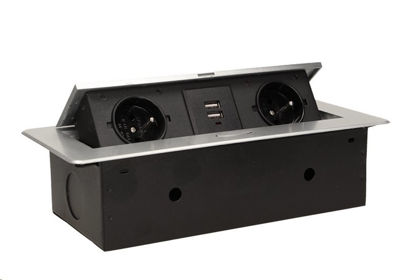 Zásuvka vestavná ORNO OR-AE-13109/G výklopnáVýklopný zásuvkový blok ve stříbrné barvě určený pro vnitřní instalaci do stolů, stolních desek, pracovních desek v kuchyni, kanceláři jak ve vertikálním tak i horizontálním směru. Výklopná část obsahuje 2 síťové zásuvky 230V se zemnícím kolíkem a 2x...
