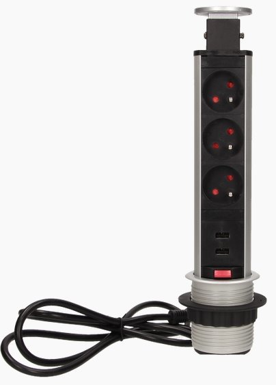 Kombinace tří síťových zásuvek s uzemněním a proudovými membránami. 2x USB port. Zařízení je určeno k instalaci do konferenčních stolů, desek kancelářského a kuchyňského nábytku. Má posuvný panel se zásuvkami, přídavný zámek a kabel o délce 1,8 m.