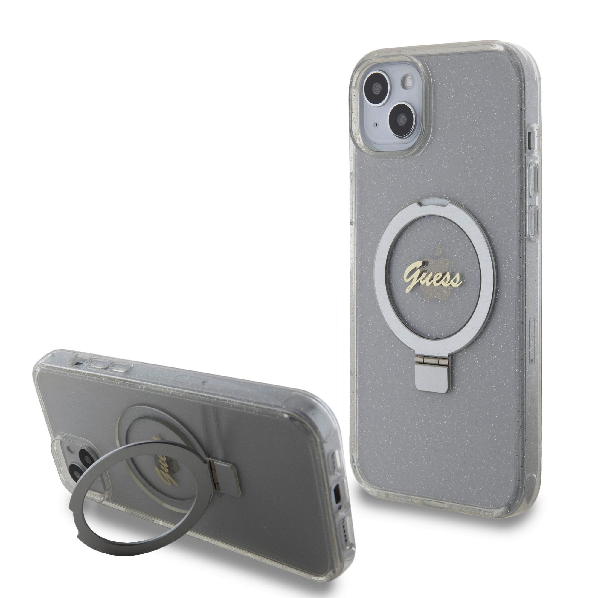 Guess IML Ring Stand Glitter MagSafe Zadní Kryt pro iPhone 15 Plus Transparent