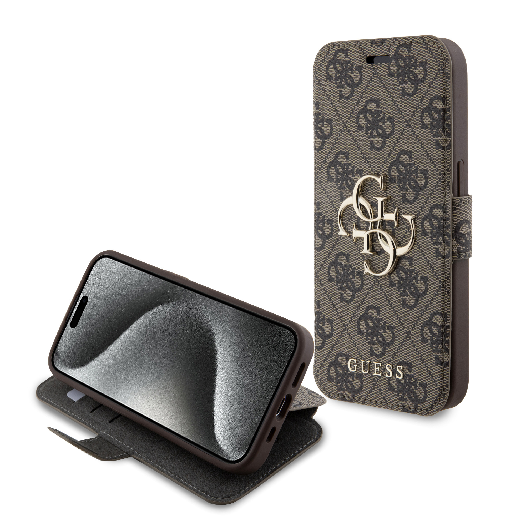 Guess PU Leather 4G Metal Logo Book Pouzdro pro iPhone 15 Pro Brown