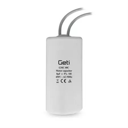 Kondenzátor rozběhový motorový 8uF 450V GETI GMC 08CRozběhový motorový kondenzátor pro čerpadla, sekačky, kompresory, ledničky a jiná zařízení s elektromotorem.Upozornění: Montáž tohoto zařízení pouze odborníkem! Nebezpečí úrazu elektrickým proudem.Technické parametry:- typ: Geti GMC 08C-...