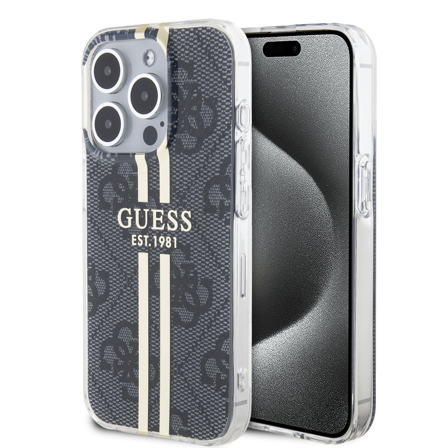 Guess IML 4G Gold Stripe Zadní Kryt pro iPhone 15 Pro Black
