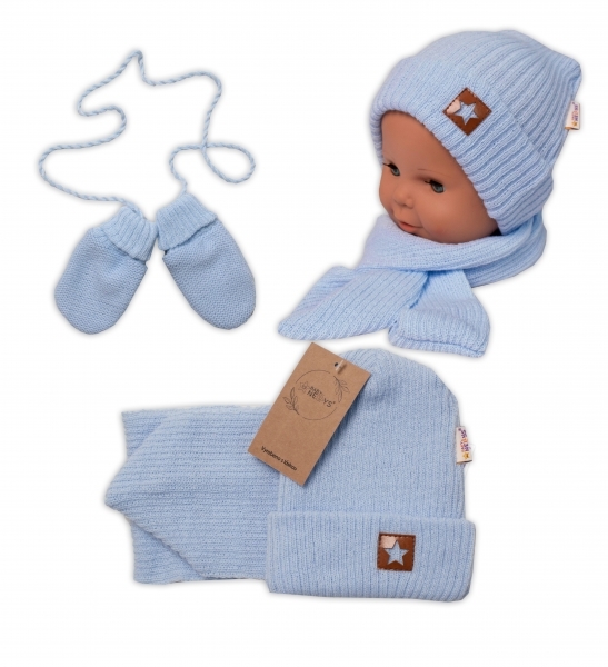 Baby Nellys Pletená čepice s šálou a rukavičky 3v1, STAR - sv. modrá, 68/74; 68/74 (6-9m)