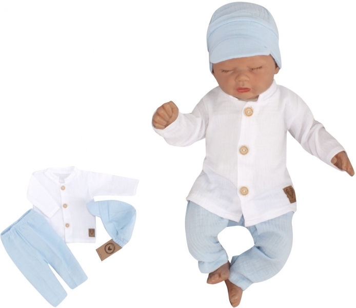 Elegantní mušelínová 3D sada - košile, kalhoty + čepice, 3D sada, bílá/modrá; 56 (1-2m)