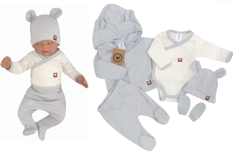 Sada do porodnice 5D, body, polodupačky, kabátek, čepička, rukavičky - šedá, vel. 62; 62 (2-3m)