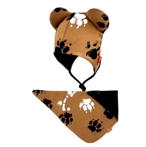 Bexa dvouvrstvá čepice na zavazování s oušky + šátek - Tlapky, hnědá, vel. 62/68