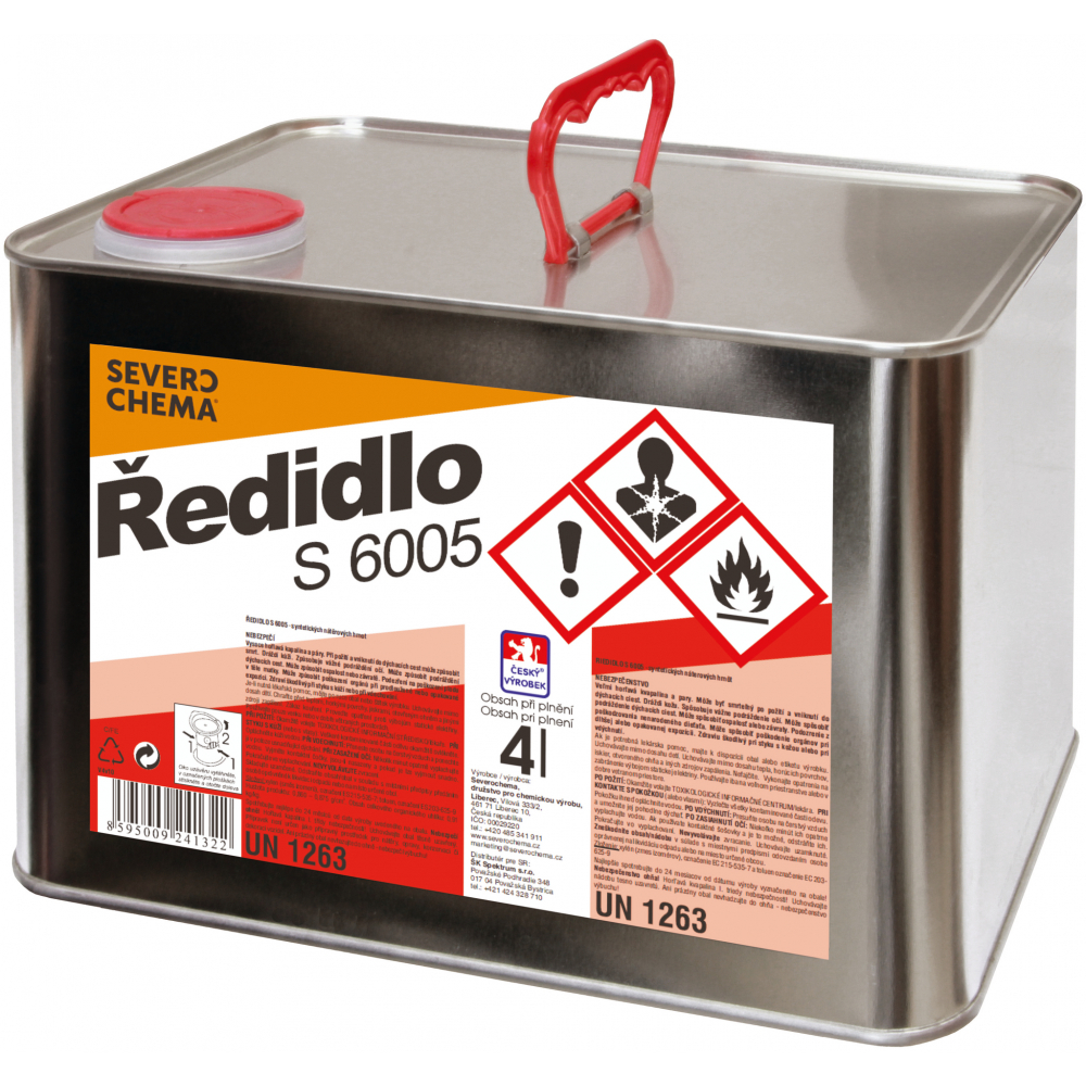 Severochema Ředidlo S6005 4 l je určeno k ředění syntetické barvy na lehké kovy S 2003 nanášené stříkáním nebo máčením, nebo syntetické barvy základní S 2035 a všude tam, kde je to předepsáno normou. Případně k&nbs... Severochema Ředidlo S6005 4 l je určeno k ředění syntetické barvy na lehké...