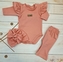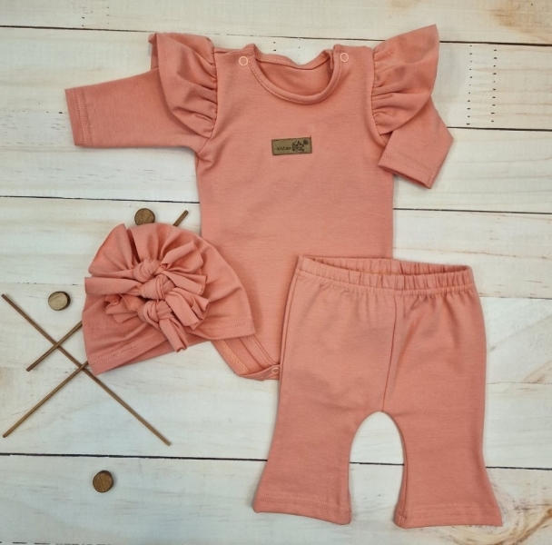 Body s volánky, legíny do zvonu a čepička, 3D, bavlna, meruňková, vel. 62; 62 (2-3m)