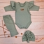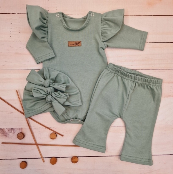 Body s volánky, legíny do zvonu a čepička, 3D, bavlna, olivová, vel. 68; 68 (3-6m)