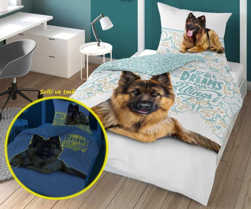 DETEXPOL Povlečení Ovčák Dream Wings svítící 140/200, 70/80Bavlněné povlečení na velkou postel, zapínání na zip, povlečení má z každé strany jiný motiv, viz. foto, povlečení svítí ve tmě po nasvícení na denním světle, svítící efekt se může začít vytrácet po 5 vypráních, možno prát na...