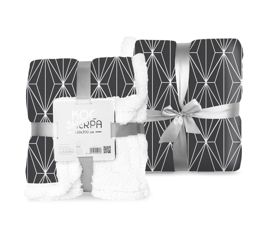 FARO Fleece deka s beránkem geometrie černobílá 150/200Fleece deka s potiskem na jedné straně a imitací beránku na druhé straně. Deka je velmi příjemná na omak, lehká a hřejivá. Deka s beránkem je vyrobena ze 100% Polyesteru, možnost prát v pračce na 40°CMateriál: 100% PolyesterRozměr: 1x150/200 cm
