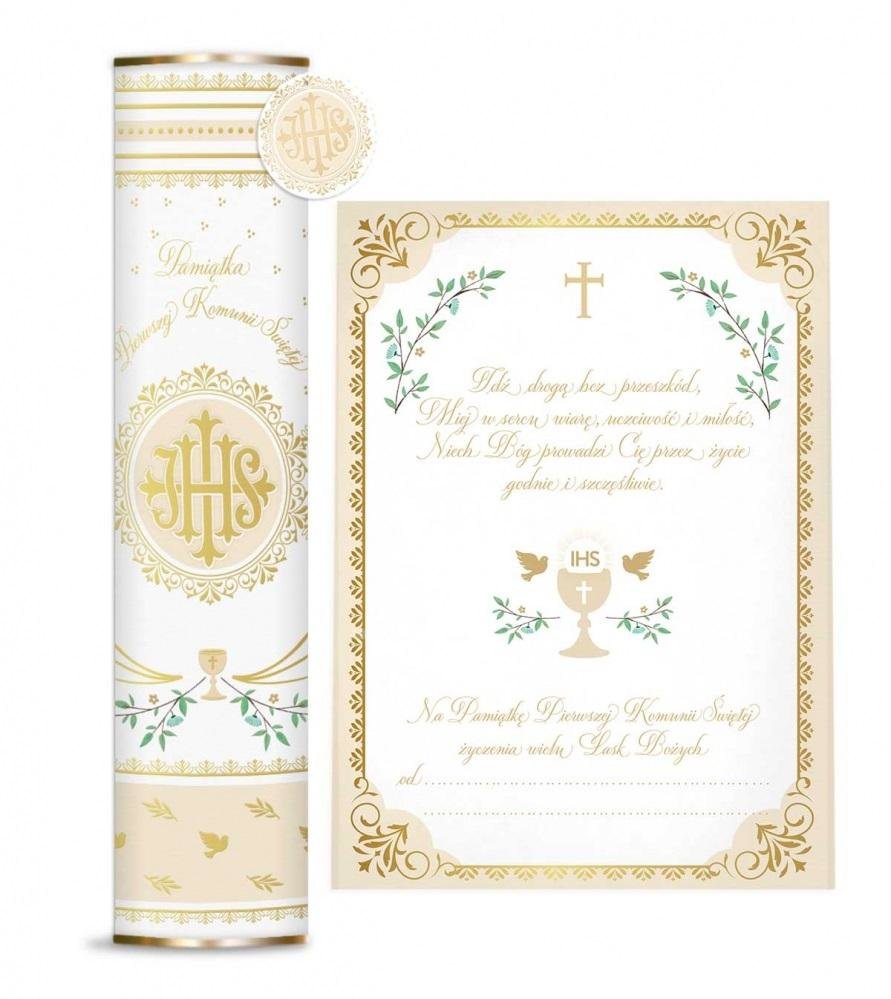 Tuba Komunijna, wysokość 25cm,średnica 5 cm. Bogato złocona, zamykana stalowymi złotymi wieczkami. W komplecie kartka z życzeniami A4 z obwolutą i bilecikiem. Całość zapakowana w worek foliowy z wstążką i przywieszką. prečítať celé