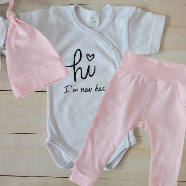 Z&Z 3-dílná soupravička body kr. rukáv, tepláčky a čepička Hi I´m new here - růžová; 50 (0-1m)