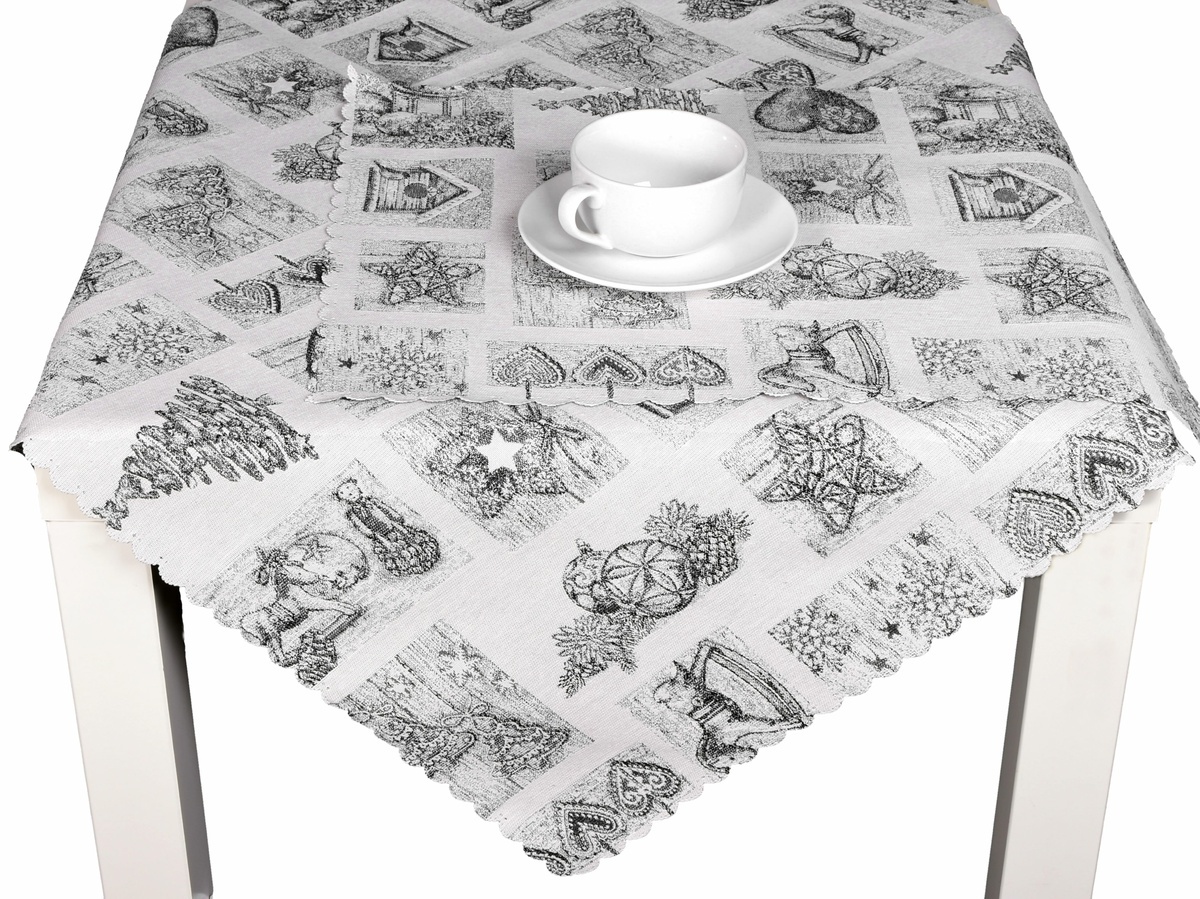 Gobelinový ubrus působí vznešeným dojmem a stříbrná lurexová niť vytváří pravou vánoční atmosféru