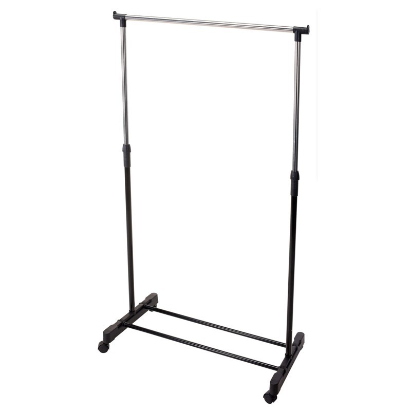 stojan na oděvy jednoduchý, 4 kolečka. 1 jednoduchá závěsná tyč, rám z nerezové oceli, černé vnější a černé tyče. tyče z nerezové oceli na horní straně: 19 mm. spodní tyče 16 mm. tloušťka 0,25 mm, pp díly černé, chromovaná závěsná tyč, 2 horní trubky. rozměry 80x43xh90-160 cm, maximální hmotnost na kus 10 kg.