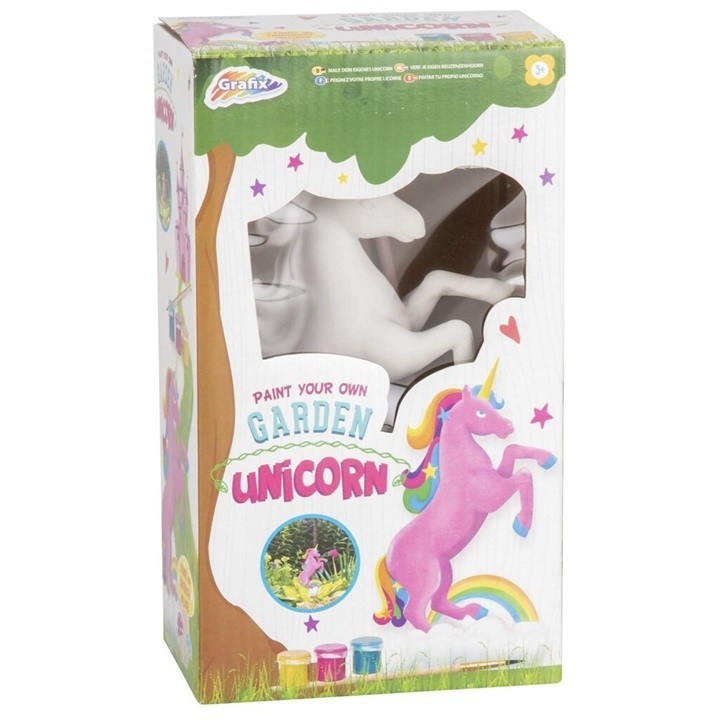Zahradní dekorace „Jednorožec“ – kreativní sada – v balení naleznete figurku, barvy a štětce. Jednorožec je matného povrchu, takže na něj barvy lehce přilnou. Zároveň je dostatečně pevný, aby odolal vnějším povětrnostním podmínkám. Na zadní straně balení naleznete také potřebné instrukce, jak si namíchat chybějící barvy spojením přidaných akrylových barev. Figurka je ideální do exteriéru i exteriéru.
