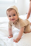 Moniel Dětská rostoucí zavazovací čepice Dots béžová je vhodná pro miminka od narození. Má praktické šňůrky, kterými lze regulovat velikost čepice a přizpůsobit velikosti hlavičky miminka. Šňůrky zavážete pod bradou miminku a čepička tak drží na svém místě a nesjíždí. Ručně šitá v ČR. Velikost od narození do 2 let.