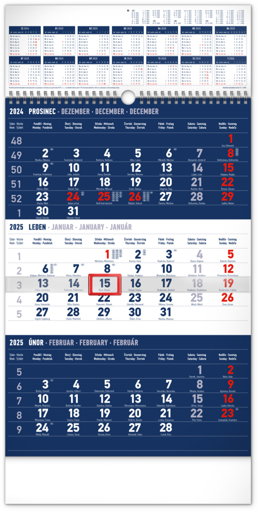 Kalendář 2025 nástěnný: 3měsíční standard modrý - s ročním přehledem, 29,5 × 43 cm (česky)