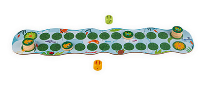 Která žabka bude první ve svém rybníku? Společenská hra pro děti na rychlost a stretegické myšlení. Hra je určena pro 2 hráče od 3 let. Balení obsahuje herní desku složenou ze 4 kartonových puzzle dílků, 8 dřevěných žetonů s žabkami a 2 dřevěné kostky. Rozměr hracího plánu je 38 x 8,1 cm. Hra ze série Hry na rychlost (Racing games). Hra rozvíjí: Počítání zručnost a podpora jemné motoriky