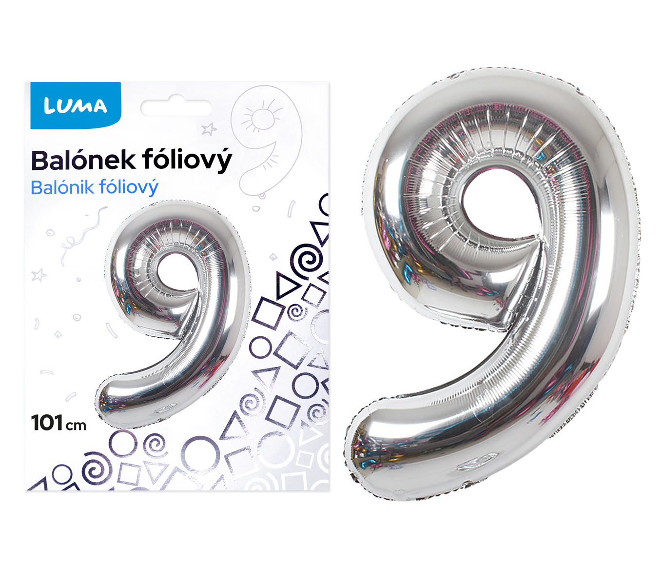 Balónek foliový č. 9 STŘÍBRNÝ 101cm LUMA