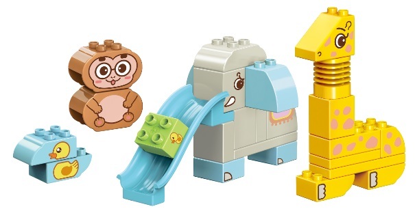 Sada kostek pro nejmenší, kostičky mají zvířecí potisk a děti z nich mohou postavit opici, slona, žirafu a kachničku. Vyrobeno z netoxického ABS plastu, v balení 26 dílků.