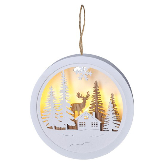 Interiérová bateriová kruhová vánoční LED dekorace o průměru 14 cm s obrázkem zimních stromů, chaty a jelena je podsvícena 4 integrovanými LED diodami s příjemným teplým bílým svitem pro navození pohodové vánoční atmosféry. Pro výrobu bylo použito přírodní dřevo v kombinaci s plastem v bílém a...