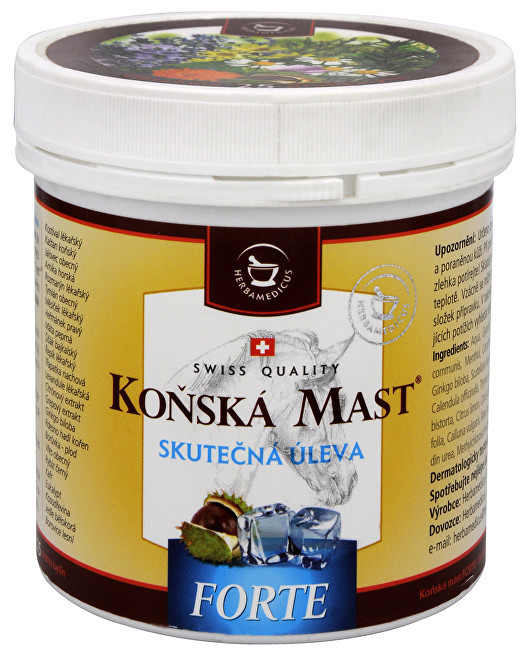 Koňská mast Forte chladivá je unikátní bylinný balzám se zesíleným účinkem vyrobený z 25 druhů bylin a je určen k masáži. Obsahuje zvýšený podíl účinných aktivních látek, které pomáhají při žilní nedostatečnosti, jejíž typickými příznaky jsou unavené a "těžké" nohy s otoky, pocity napětí a "mravenčení" v nohách.