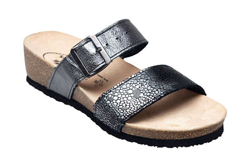 Zdravotní obuv - dámské pantofle,barva: černá s metalickým odleskem, vzor,podešev: černá,stélka: anatomicky tvarovaná, kožená,materiál: kůže,zapínání na přezku. prečítať celé