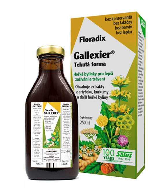 Floradix Gallexier napomáhá při trávení těžkých jídel a zmírňuje zažívací potíže, zmírňuje pocit plnosti a působí proti nadýmání. Obsahuje 10 hořkých bylin: artyčok, pampeliška, hořec, kurkuma, řebříček, zázvor, fenykl, heřmánek, kardamom, vachta trojlistá. prečítať celé