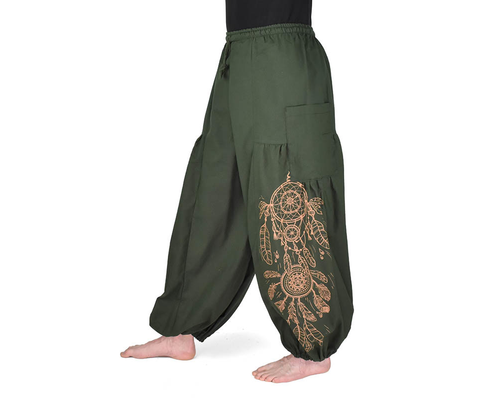 Pohodlné bavlněné kalhoty v balonovém střihu.Popis: v pase guma a šňůrka na stažení, dvě boční kapsy, nohavice do gumy, kontrastní orientální potisk