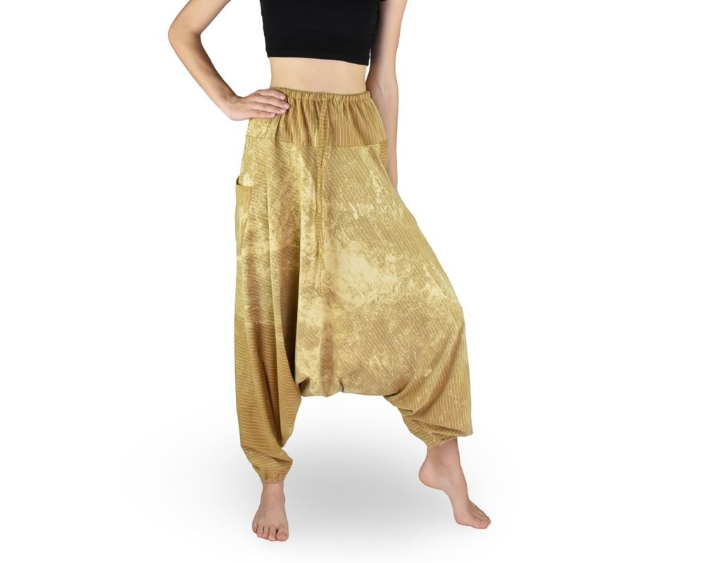 Oblíbené pohodlné harémové kalhoty. V pase a u kotníků guma. V pase šňůrka na stažení. Na každé nohavici po stranách kapsa. Materiál: 75 % bavlna, 25 % polyester Rozměry: Délka: 105 cm Pas: 31 - 51 cm