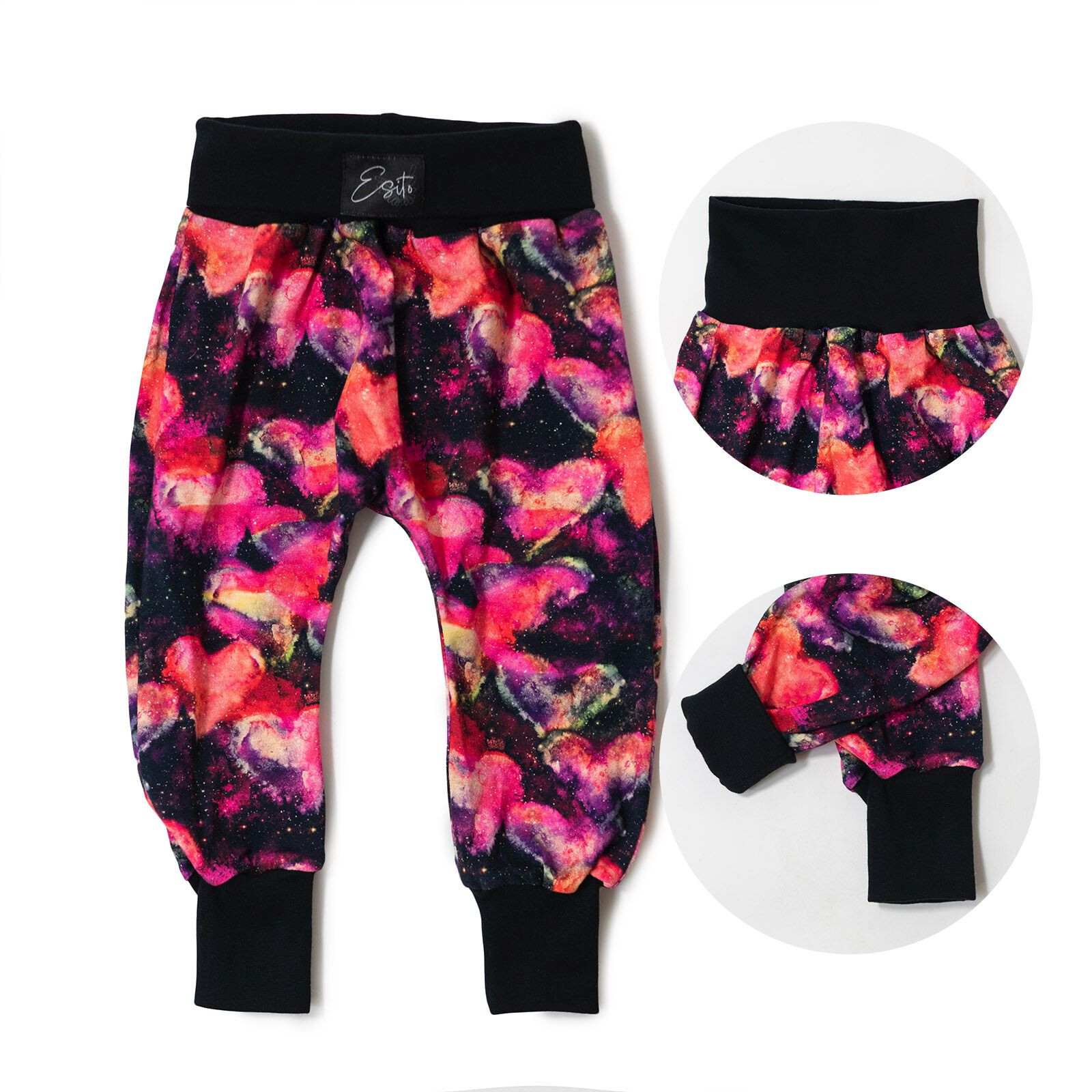 Dětské tepláky s vysokým pasem Duhová srdce; Barva: černá; Velikost: 74