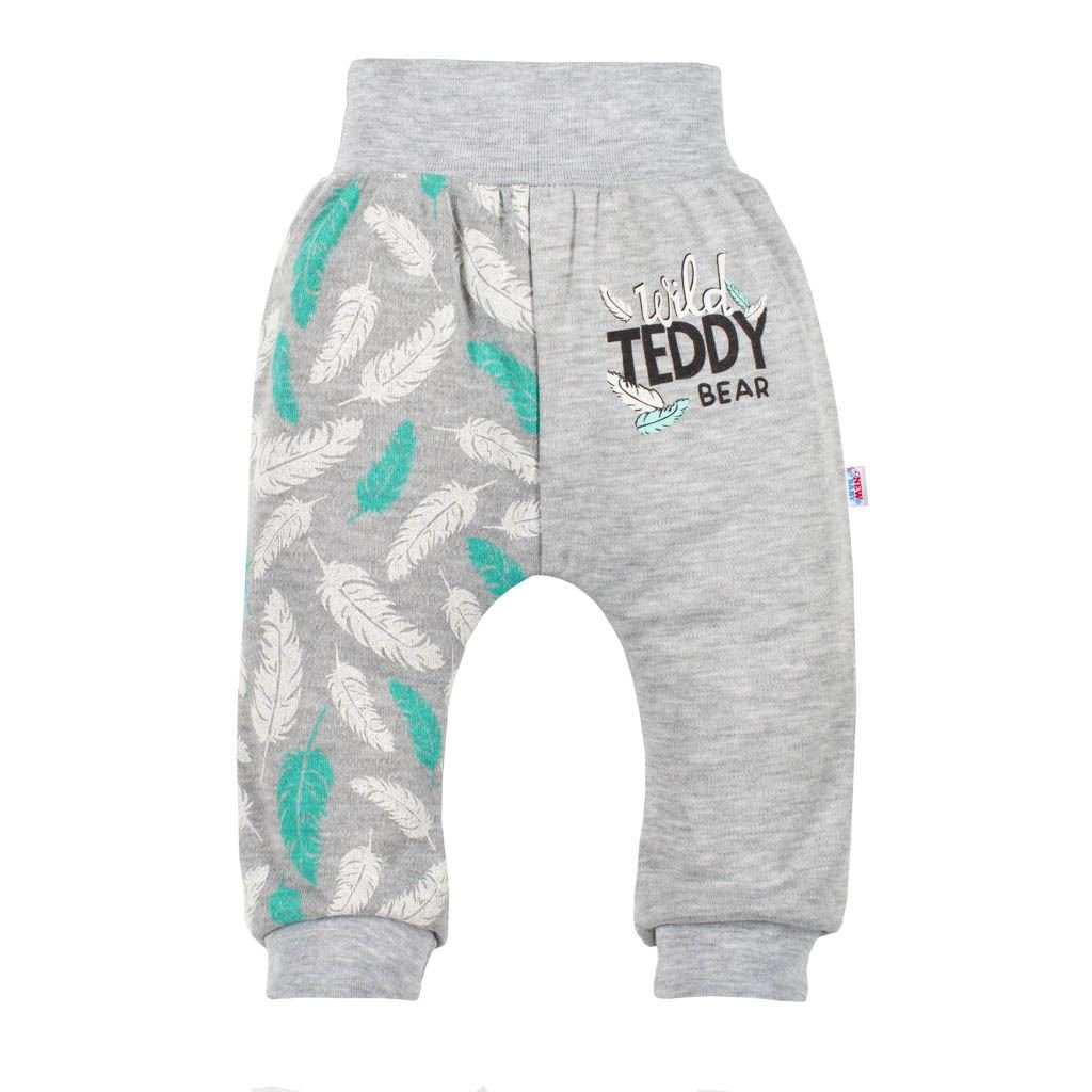 Bavlněné kojenecké tepláčky české značky New Baby Wild Teddy pro miminka. Tepláčky jsou jednobarevné a zdobí je nápis wild Teddy Bear. V pase mají širší gumičku, která netlačí na bříško miminka a barevnou šňůrku. Stylový snížený sed dodává tepláčkům správný šmrc. Složení: 100% bavlna.