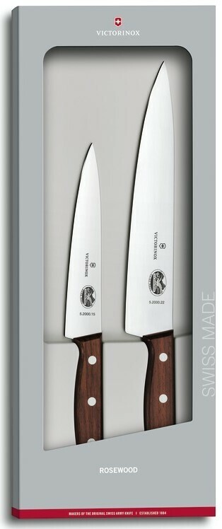 Dva nože tejto súpravy sú vyrobené z vysoko kvalitných drevených rúčok s unikátnym vzorovaním a sú starostlivo ručne leštené. Kým 15 cm kuchynský nôž je ideálny na rezanie menšieho ovocia a zeleniny, 22 cm mäsiarsky nôž odborne nakrája varené a grilované mäso.