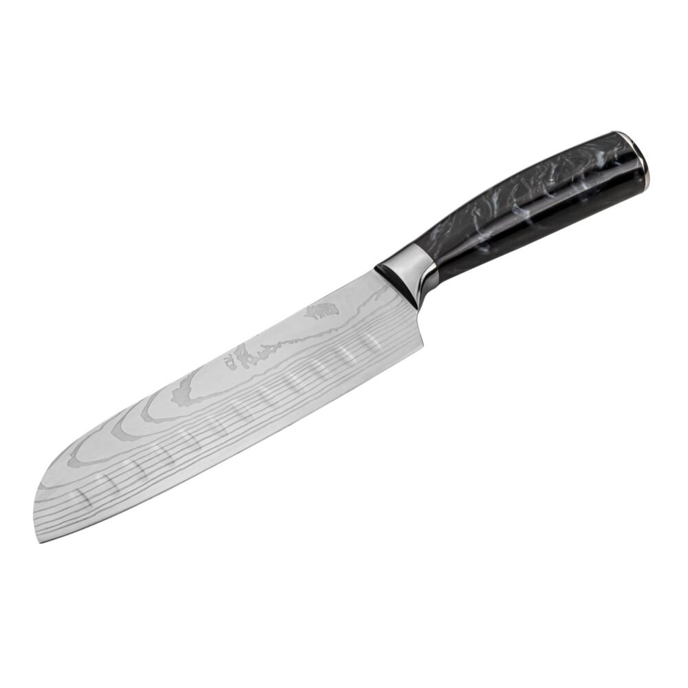 RESTO 95332 Nůž Santoku 19 cm (ERIDANUS)Antibakteriální povrchLaserem gravírovaná čepel stylizovaná do damaškové oceliErgonomická rukojeťSnadno se čistíStylový designMateriál: Nerezová ocelMateriál rukojeti: BakelitVynikající designJedinečný laserový damaškový obtisk a speciálně navržená rukojeť...
