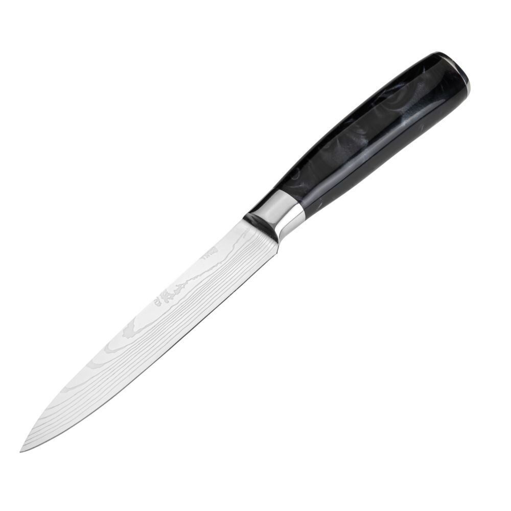 RESTO 95334 Nůž univerzální 13 cm (ERIDANUS)Antibakteriální povrchLaserem gravírovaná čepel stylizovaná do damaškové oceliErgonomická rukojeťSnadno se čistíStylový designMateriál: Nerezová ocelMateriál rukojeti: BakelitVynikající designJedinečný laserový damaškový obtisk a speciálně navržená...