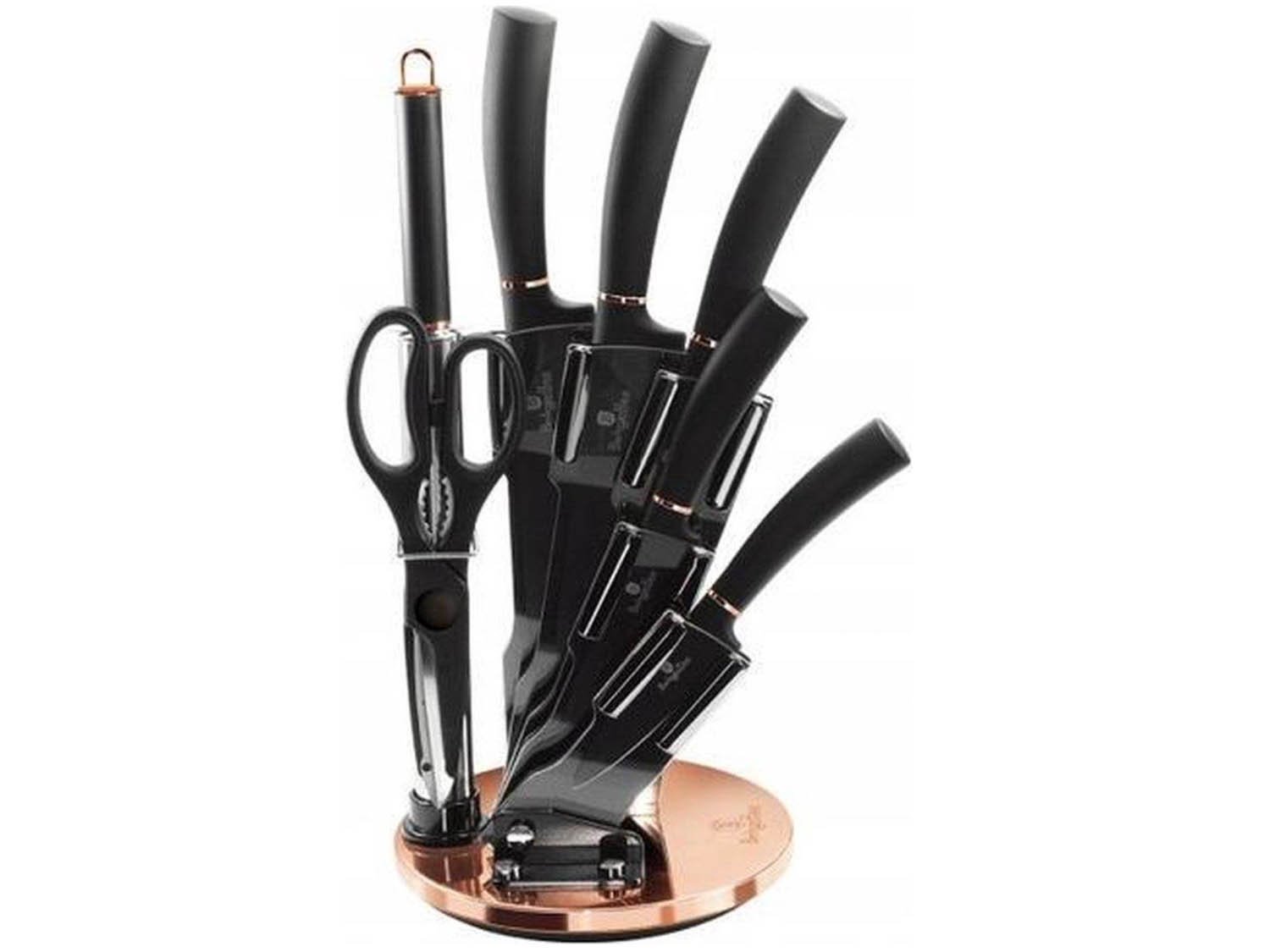 - nerezová ocel s nepřilnavým povrchem, nepřilnavé laserem broušené čepele, ergonomické protiskluzové SoftTouch rukojeti, designový stojan na nože