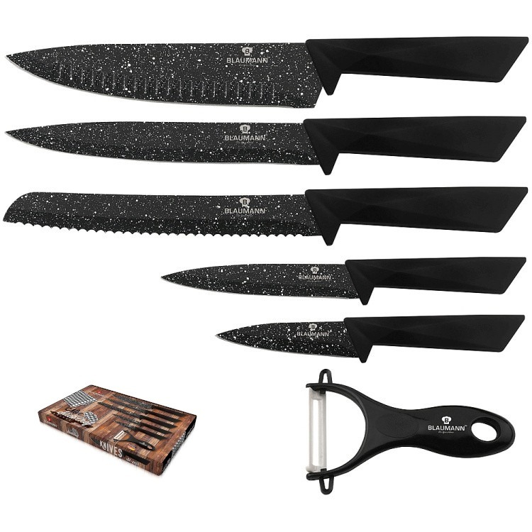 - sada obsahuje kuchařský nůž 19 cm, nůž na pečivo 19 cm, porcovací nůž 19 cm, univerzální nůž 11.5 cm, nůž na zeleninu 9 cm, škrabka