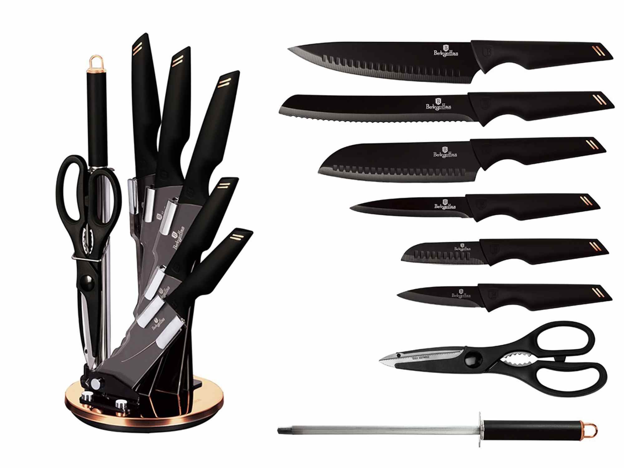 sada kvalitních kuchyňských nožů, ocilky a nůžek ve stylovém otočném stojanu, v dárkové krabici materiál nerezová ocel s nepřilnavým povrchem, měkčená ergonomická rukojeť sada obsahuje nůž Santoku 17.5 cm, kuchařský nůž 20 cm, nůž na pečivo 20 cm, univerzální nůž 12.5 cm, loupací nůž 9 cm, nůž...